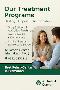 Ali Rehab Center Pvt. Ltd. – Best Rehab Center in Islamabad Ali Rehab Center Pvt. Ltd. is a trusted treatment center in Islamabad, specializing in comprehensive addiction treatment services and mental health treatment. Our dedicated team of psychiatrists, clinical psychologists, medical officers, and therapists creates personalized, evidence-based treatment plans tailored to each individual, ensuring a complete and holistic recovery. We provide specialized programs including medical detox, psychotherapy, counseling, and rehabilitation, all delivered in a safe and supportive environment. Our modern therapies focus on long-term wellness and relapse prevention, helping patients regain control over their lives. IHRA Registration # 2025/00919